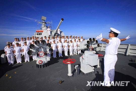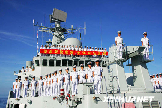 “廣州”號導(dǎo)彈驅(qū)逐艦跨越祖國傳統(tǒng)海疆線,回到祖國懷抱,艦上全體官兵在南海舉行回歸祖國儀式。
