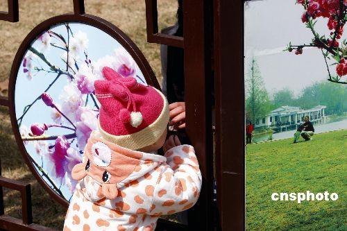 3月27日,北京又到櫻花爛漫時(shí),玉淵潭公園櫻花節(jié)游人如織,一名天真的兒童在廣告展板處玩耍。中新社發(fā) 鄭雄增 攝