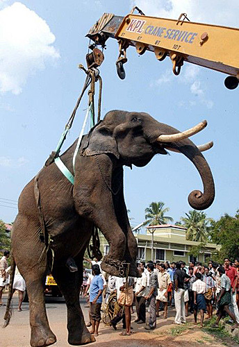 4月1日,印度喀拉拉邦一頭公象在交通繁忙的公路上被一輛卡車撞到,兩條后腿骨折和背部受傷,獸醫(yī)不得不動(dòng)用起重機(jī)來搬運(yùn)這個(gè)“龐然大物”。據(jù)報(bào)道,這頭大象高9英尺(約2.7米),重達(dá)6噸,剛剛從附近的一家印度教寺廟逃出。在事發(fā)現(xiàn)場,數(shù)百名觀眾正在觀看獸醫(yī)如何救治受傷的大象和如何將它搬離現(xiàn)場。一名獸醫(yī)表示,這頭大象體型龐大,情緒極不穩(wěn)定。不過,它此前一直生活在附近人來人往的寺廟,所以對(duì)人并不十分恐懼。在對(duì)大象做過全面評(píng)估后,他們決定從附近的建筑工地上征用一輛起重機(jī),將這頭大象吊到卡車上,將它運(yùn)往一家獸醫(yī)醫(yī)院。據(jù)悉,搬運(yùn)工作進(jìn)展得十分順利。不過,令人可悲的是,盡管獸醫(yī)在努力救治這頭大象,但由于它的傷勢過于嚴(yán)重,于當(dāng)天晚間死去。