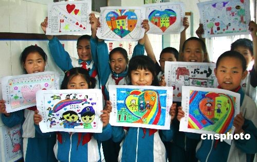 近日,為紀(jì)念“5·12”大地震一周年,山東省淄博市桓臺(tái)縣索鎮(zhèn)中心小學(xué)的小學(xué)生精心制作了512張“心愿卡”,表達(dá)了與災(zāi)區(qū)小朋友心連心的親情。據(jù)了解,這512張心愿卡有的表達(dá)了對(duì)在災(zāi)難中逝去的同胞的緬懷,有的表達(dá)了對(duì)經(jīng)歷災(zāi)難后的小伙伴們的支持與鼓勵(lì),祝愿他們更堅(jiān)強(qiáng)更快樂面對(duì)人生。這批“心愿卡”將通過淄博“重訪四川獻(xiàn)愛心”的志愿者轉(zhuǎn)交到災(zāi)區(qū)小伙伴手中。圖為小學(xué)生們在展示精心制作的“心愿卡”。中新社發(fā) 田廷芳 攝