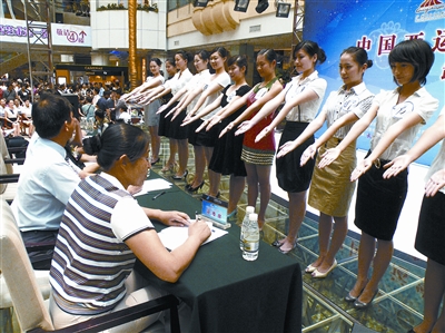 “請(qǐng)把劉海撥開”、“把小腿露出來”、“上前一步伸出雙手”、“請(qǐng)繞場(chǎng)一圈”……12日,“2009年中國(guó)亞運(yùn)空姐招募大匯”武漢賽區(qū),面試全部結(jié)束,5位專業(yè)評(píng)委嚴(yán)格按照標(biāo)準(zhǔn)篩選,1022名佳麗僅有542人拿到通行證,晉級(jí)下一輪。