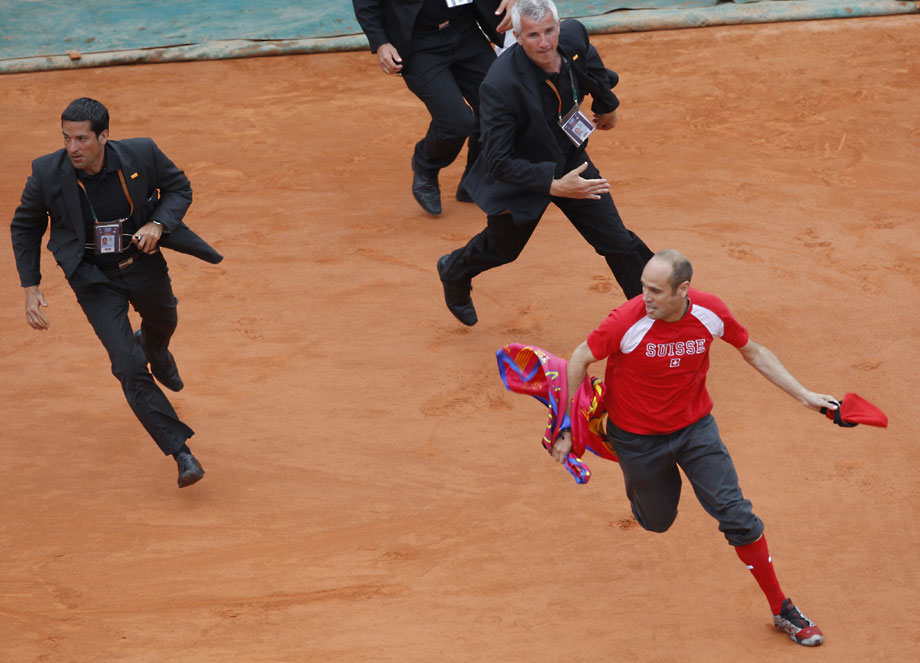 法網(wǎng)男單決賽場上,一位費天王的癡心球迷沖入球場,強行將自制的一頂帽子戴到費德勒的頭上。安保人員及時出現(xiàn),將狂熱粉絲架出場外。