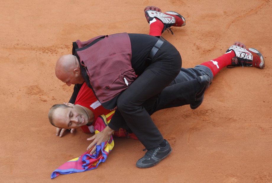 法網(wǎng)男單決賽場上,一位費(fèi)天王的癡心球迷沖入球場,強(qiáng)行將自制的一頂帽子戴到費(fèi)德勒的頭上。安保人員及時出現(xiàn),將狂熱粉絲架出場外。
