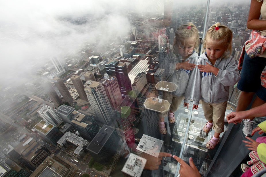 7月1日,美國芝加哥,西爾斯大廈在第103層瞭望臺增設的玻璃陽臺對媒體開放。這些玻璃陽臺建在大廈西側,從瞭望臺向外延伸約1.2米。陽臺的玻璃地板厚達12.7厘米,可承重約5噸。