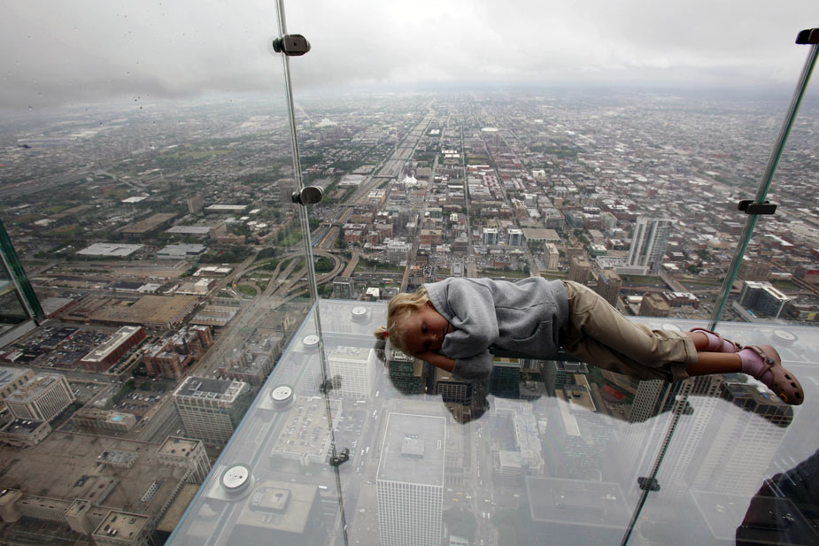 7月1日,美國芝加哥,西爾斯大廈在第103層瞭望臺增設(shè)的玻璃陽臺對媒體開放。這些玻璃陽臺建在大廈西側(cè),從瞭望臺向外延伸約1.2米。陽臺的玻璃地板厚達12.7厘米,可承重約5噸。