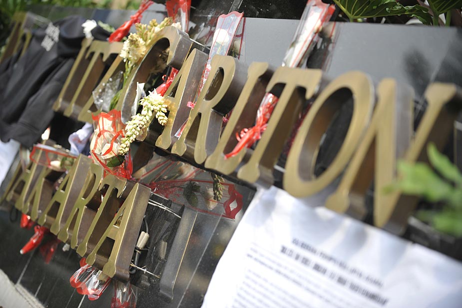 7月18日,印度尼西亞首都雅加達(dá)的民眾紛紛來(lái)到發(fā)生爆炸的萬(wàn)豪酒店和麗嘉酒店,向死難者獻(xiàn)花表示哀悼。