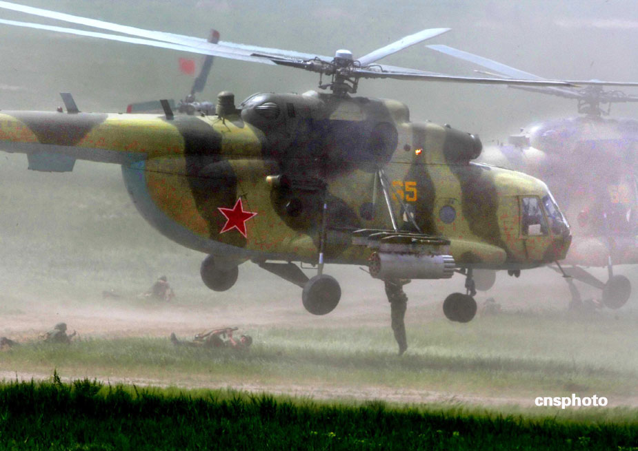 中國、俄羅斯兩軍總參謀長,7月23日上午到沈陽軍區(qū)洮南合同戰(zhàn)術(shù)訓(xùn)練基地,觀看“和平使命2009”聯(lián)合反恐軍事演習(xí)。雙方以陸軍和空軍為主,中方參演部隊包括1個陸軍戰(zhàn)斗群和1個空軍戰(zhàn)斗群。俄方參演兵力包括1個陸軍加強摩步營、1個空降突擊連和部分空軍兵力,雙方投入兵力兩千多人。中新社發(fā) 宋吉河 攝
