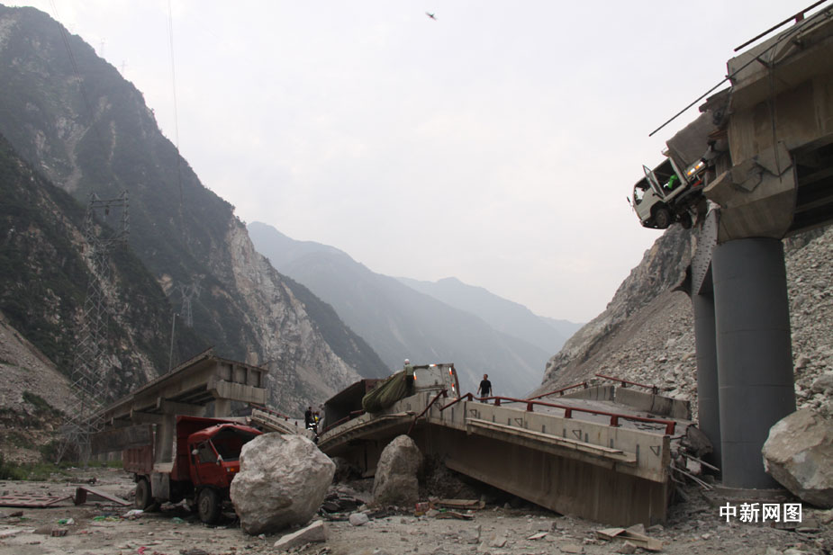 25日凌晨四點(diǎn)鐘左右,汶川縣境內(nèi)國道二一三線徹底關(guān)大橋被山上飛下來的巨石砸斷,已造成100米的橋面坍塌,7輛汽車受損,12人不同程度受傷,3人死亡,都汶路通行中斷。汶新 攝