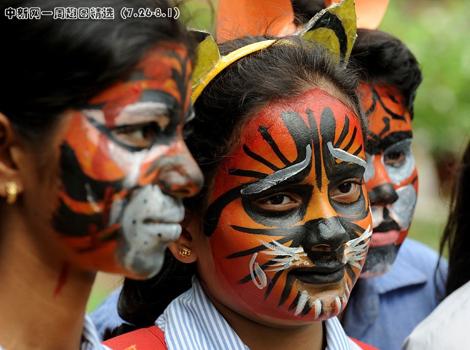 7月28日,約2000名學(xué)生在新德里化妝成老虎的臉譜,圍坐成老虎的造型。點(diǎn)擊觀看詳細(xì)內(nèi)容