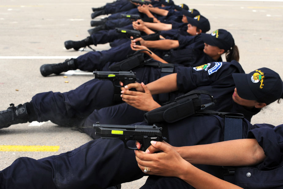 圖為女警察學(xué)員展示射擊技術(shù)。