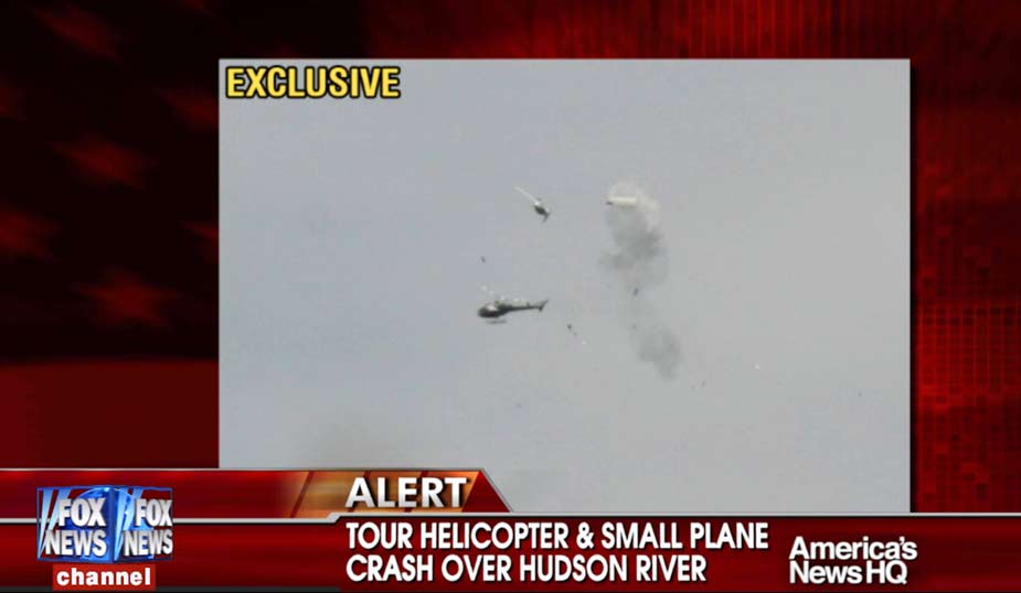 8月8日,紐約市曼哈頓西側(cè)的哈德遜河上空,一架觀光直升飛機(jī)和一架小型飛機(jī)相撞,兩飛機(jī)雙雙墜入河中。據(jù)稱觀光直升飛機(jī)上載有五名意大利游客和一名飛行員,而小型飛機(jī)上則有三人。圖為電視臺(tái)播放的兩飛機(jī)相撞的視頻截圖。