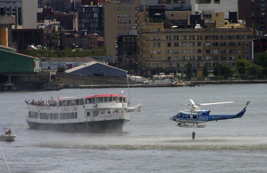 8月8日,紐約市曼哈頓西側的哈德遜河上空,一架觀光直升飛機和一架小型飛機相撞,兩飛機雙雙墜入河中。據(jù)稱觀光直升飛機上載有五名意大利游客和一名飛行員,而小型飛機上則有三人。圖為救援直升機在現(xiàn)場搜救。