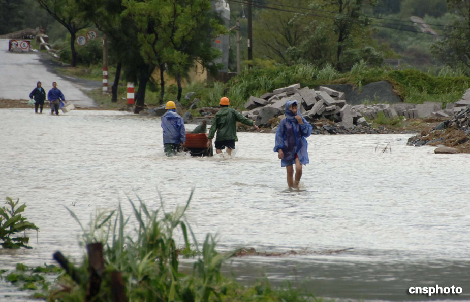 8月9日16時20分,第8號臺風(fēng)“莫拉克”在福建省霞浦縣沿海登陸,登陸時臺風(fēng)中心最大風(fēng)速12級(33米/秒),中心氣壓970百帕。“莫拉克”帶來的強降雨致使福建霞浦許多路段被淹。中新社發(fā) 王東明 攝