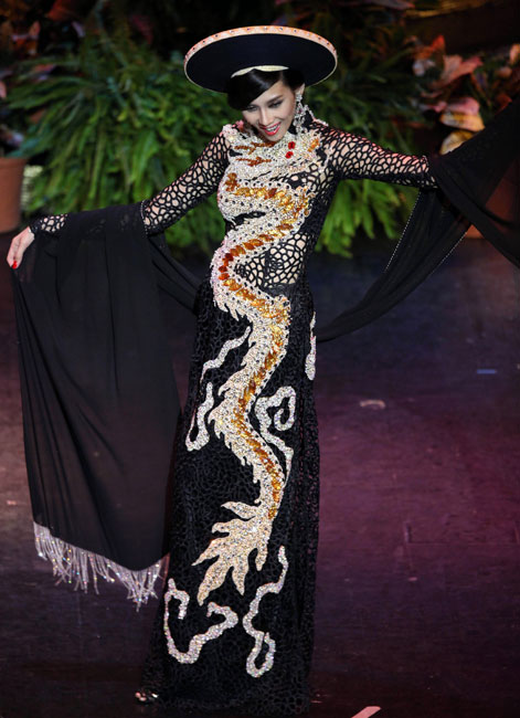 圖為越南小姐武文杰穿著融入民族元素的服飾登臺(tái)展示。