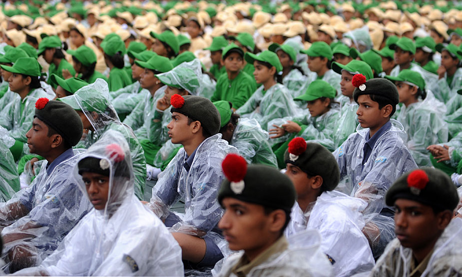 圖為印度民眾在雨中靜聽(tīng)印度總理辛格的講話。