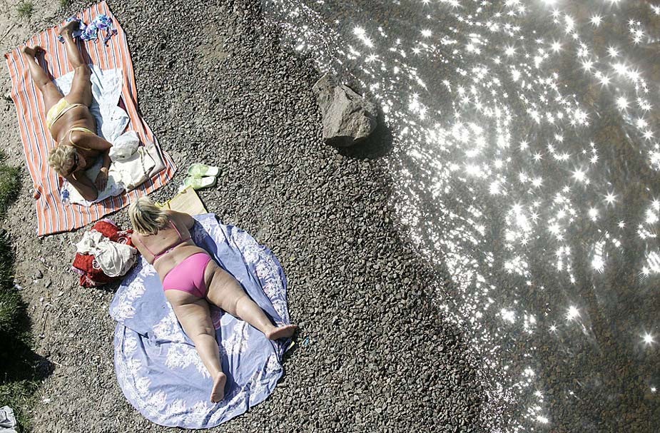 游人們在烏克蘭基輔的沙灘上曬日光浴。