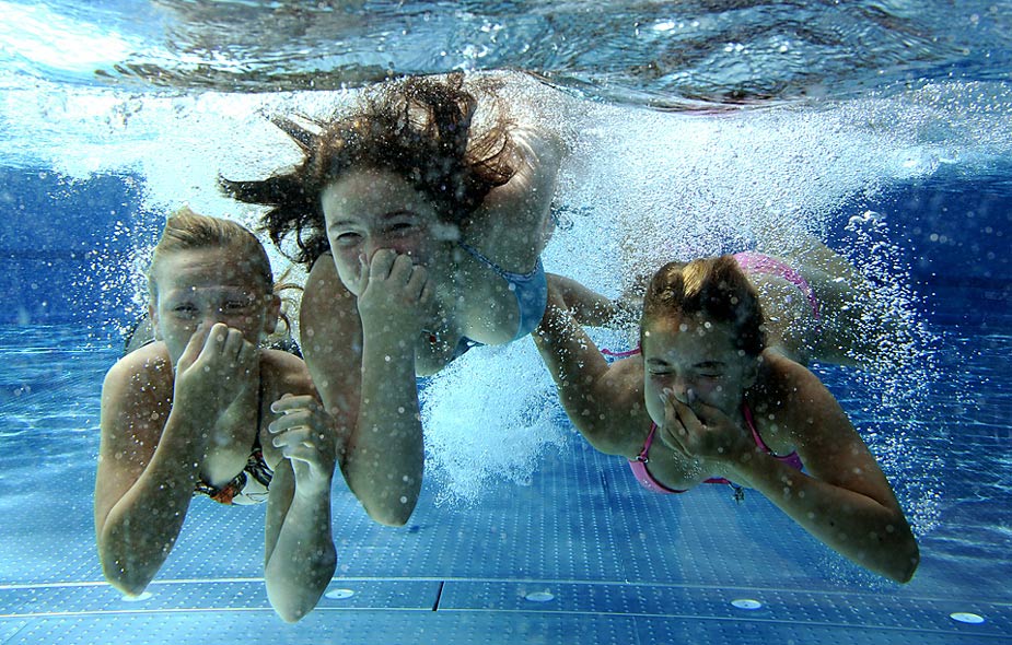 德國東部城市拉德博伊爾,三個女孩在泳池里嬉戲。