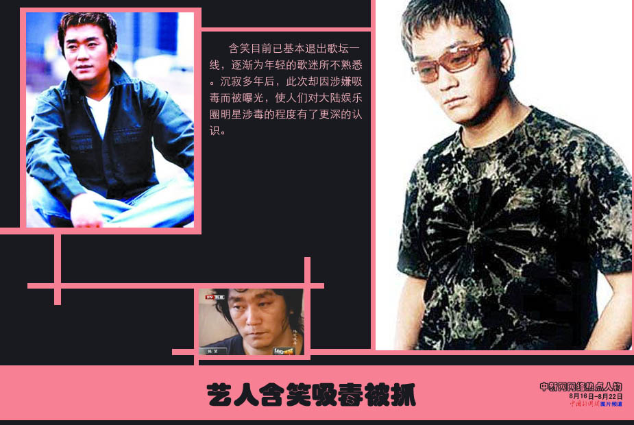 中新網(wǎng)本周熱點人物之——含笑 北京警方十四日證實,市公安局禁毒處根據(jù)線索,在京城的兩個城區(qū)相繼查獲十名涉嫌吸毒人員并起獲部分毒品,這十名吸毒者中包括了中國著名歌手含笑。