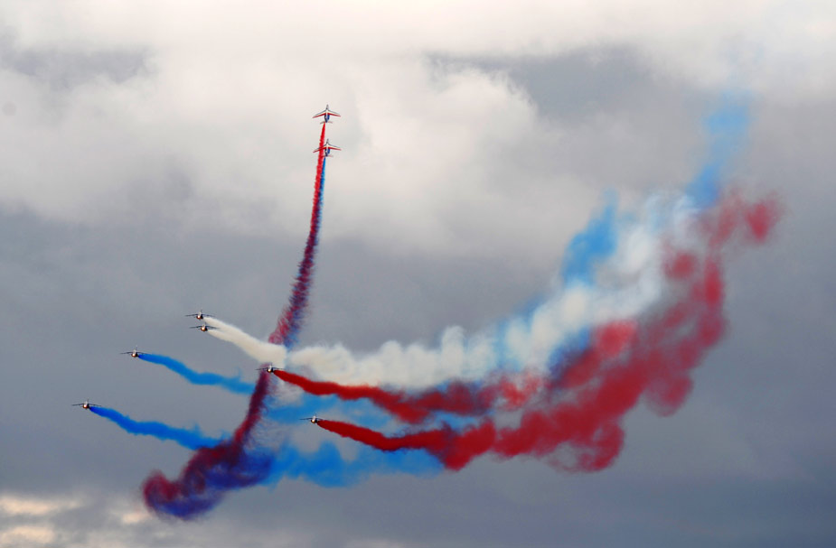 8月21日,在俄羅斯茹科夫斯基市舉行的第九屆國際航空航天展覽會上,法國著名的“法蘭西巡邏兵”飛行表演隊進(jìn)行了精彩的飛行表演。