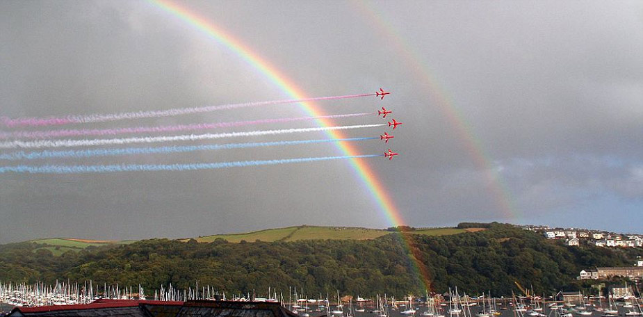 據(jù)英國媒體近日報(bào)道,英國皇家空軍“紅箭”飛行表演隊(duì)20日在英國康沃爾郡福伊港進(jìn)行飛行特技表演時(shí),恰巧天邊出現(xiàn)一道彩虹,相映成輝,異常漂亮。