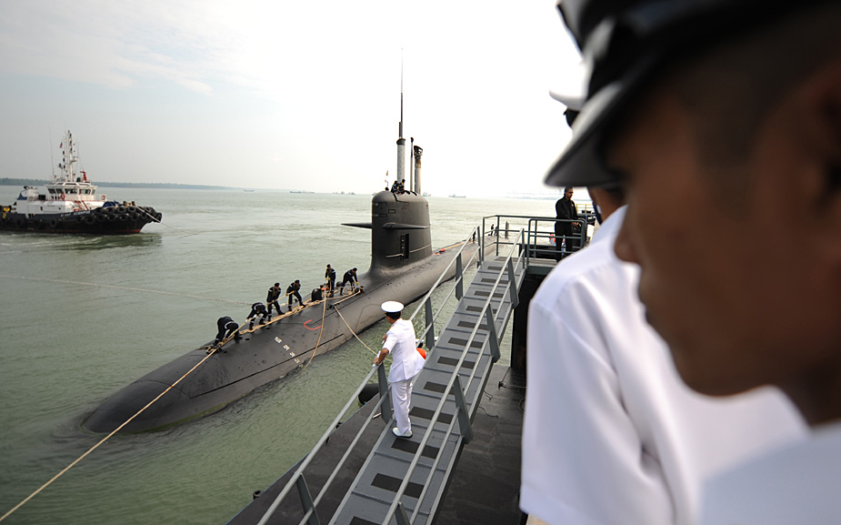 9月3日,由法國制造的馬來西亞首艘“鲉魚”級潛艇“東古·阿卜杜勒·拉赫曼”號駛?cè)腭R來西亞首都吉隆坡的克朗港。圖片來源:中國新聞網(wǎng)