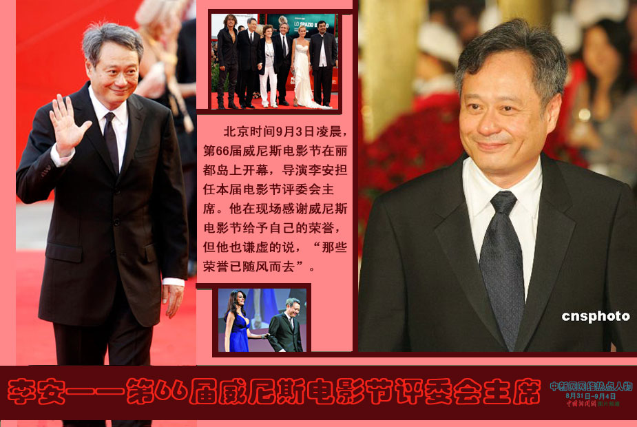 中新網(wǎng)本周熱點人物之——李安 北京時間9月3日凌晨,第66屆威尼斯電影節(jié)在麗都島上開幕,導演李安擔任本屆電影節(jié)評委會主席。他在現(xiàn)場感謝威尼斯電影節(jié)給予自己的榮譽,但他也謙虛的說,“那些榮譽已隨風而去”。來源:中國新聞網(wǎng)、新京報