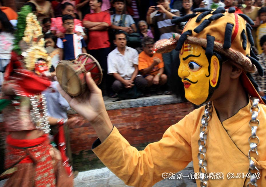 9月1日,尼泊爾加德滿都因陀羅節(jié)盛大開幕,人們戴上傳統(tǒng)的面具跳舞,熱烈的慶;顒訉⒊掷m(xù)多天。圖片來源:中國新聞網(wǎng)