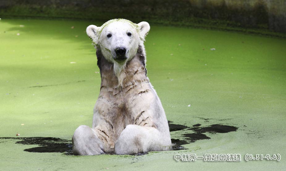 9月4日,德國(guó)柏林動(dòng)物園的明星北極熊克努特正在水中“自?shī)首詷?lè)”。圖片來(lái)源:中國(guó)新聞網(wǎng)