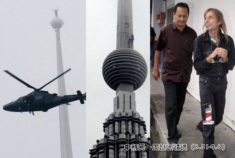 9月1日,現(xiàn)年46歲的法國“蜘蛛俠” 阿蘭•羅伯特成功爬上了馬來西亞最高的建筑物——吉隆坡的雙子塔,但隨后被警方逮捕。圖片來源:中國新聞網(wǎng)