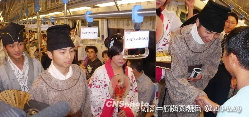 三日上午,三位身著古裝的年輕人在南京地鐵首列品牌列車“人文號(hào)”里,與乘客一起朗誦詩歌、知識(shí)競答。圖片來源:中國新聞網(wǎng)