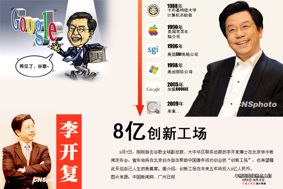 中新網(wǎng)本周熱點(diǎn)人物之——李開復(fù) 剛剛辭去谷歌全球副總裁、大中華區(qū)職務(wù)總裁的李開復(fù)博士在北京舉辦新聞發(fā)布會(huì),宣布他將在北京創(chuàng)辦旨在幫助中國青年成功創(chuàng)業(yè)的“創(chuàng)新工場”,也希望藉此開啟自己人生的新篇章。據(jù)介紹,創(chuàng)新工場在未來五年將投入8億人民幣。