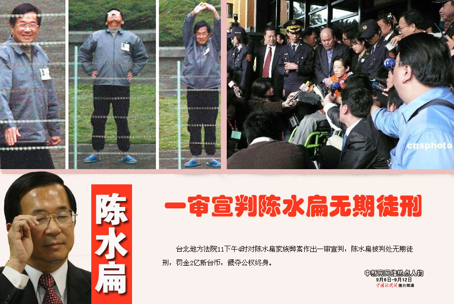 中新網(wǎng)本周熱點(diǎn)人物之——陳水扁 臺北地方法院11下午4時對陳水扁家族弊案作出一審宣判,陳水扁被判處無期徒刑,罰金2億新臺幣,褫奪公權(quán)終身。