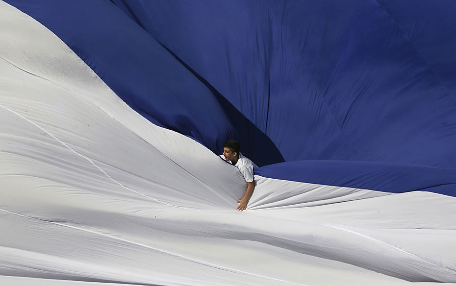 9月17日,在耶路撒冷的一個(gè)體育場內(nèi),一名以色列男孩在一幅巨大的、鋪展開的旗子上玩耍。它被吉尼斯世界紀(jì)錄評(píng)為世界上最大的旗子。圖片來源:中國新聞網(wǎng)
