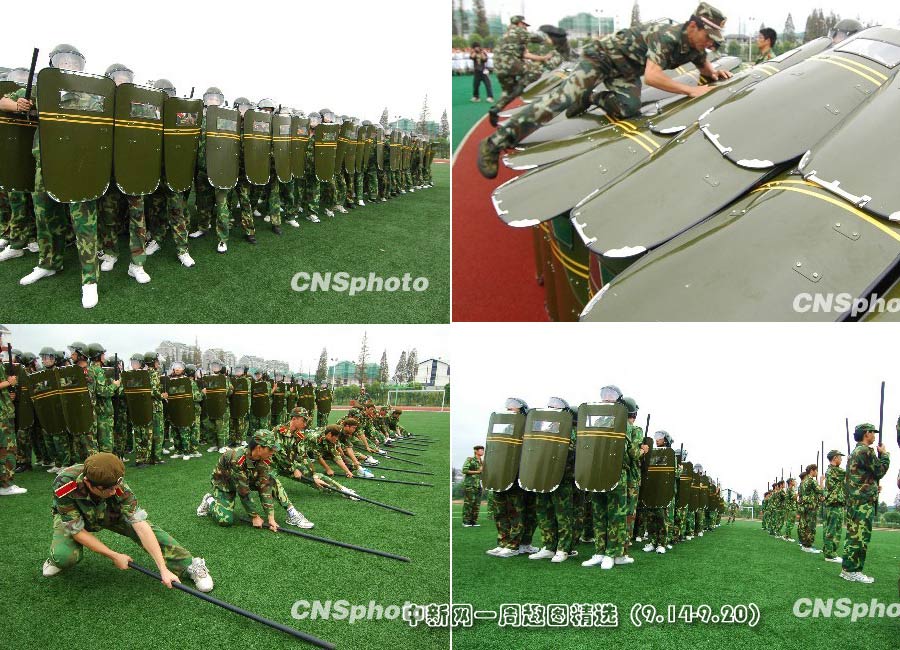 9月18日,江蘇省揚(yáng)州大學(xué)廣陵學(xué)院新生軍訓(xùn)拉開序幕。與往年不同的是,該校今年軍訓(xùn)增加了反恐防暴。圖片來源:中國(guó)新聞網(wǎng)