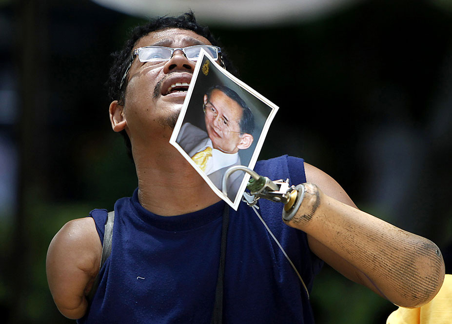 22日,在泰國首都曼谷,一名男子在醫(yī)院外為普密蓬·阿杜德的健康祈禱。 81歲高齡的泰國國王普密蓬·阿杜德于19日因發(fā)燒住進(jìn)醫(yī)院接受治療。圖片來源:中國新聞網(wǎng)