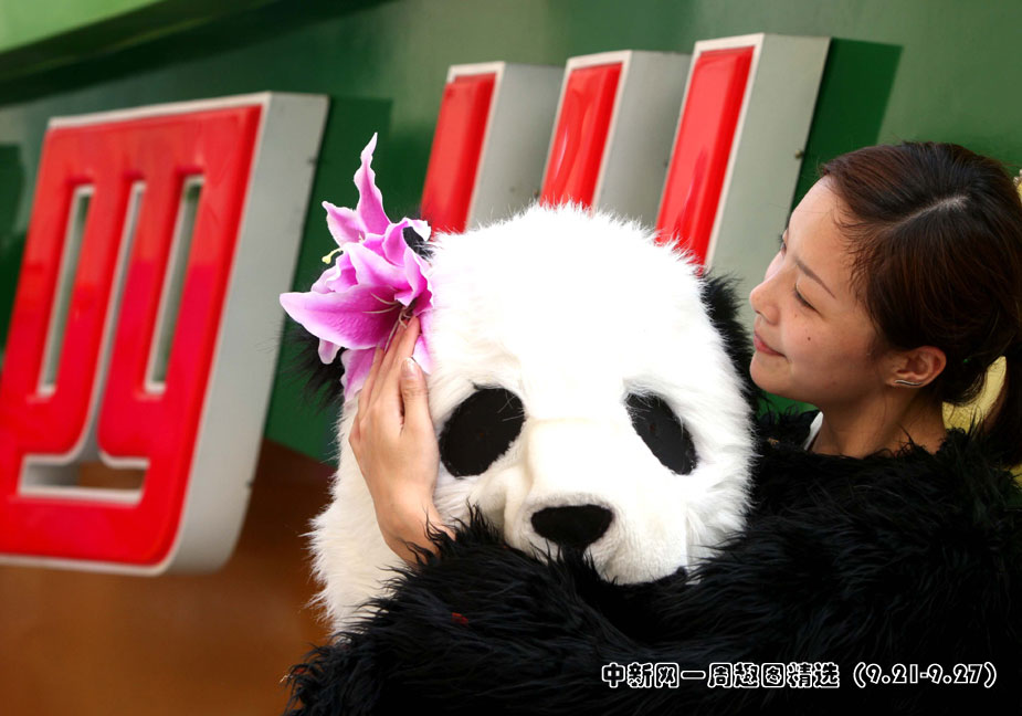 9月24日,來自四川“奮進(jìn)四川彩車”的美女演員排練之余精心打扮道具。圖片來源:中國新聞網(wǎng)