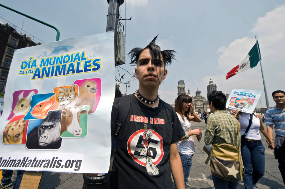 10月4日,在墨西哥首都墨西哥城,參加世界動物日活動的人們頭帶面具,手舉圖片,呼吁人們關(guān)注動物權(quán)益。來源:中國新聞網(wǎng)