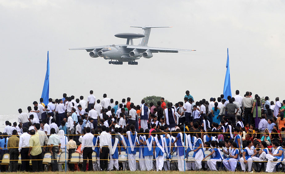 10月6日,印度空軍在新德里郊區(qū)的加濟(jì)阿巴德地區(qū)進(jìn)行了精彩的飛行表演。這次飛行表演是為了迎接印度空軍建軍77周年慶典舉行的彩排式。圖片來(lái)源:中國(guó)新聞網(wǎng)