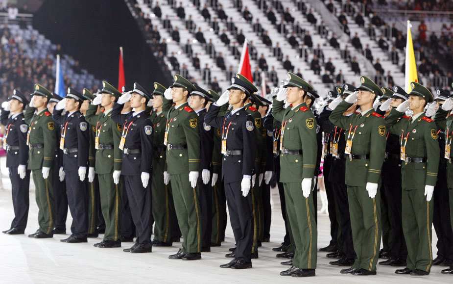 十月十六日晚,中華人民共和國第十一屆運(yùn)動(dòng)會(huì)在山東濟(jì)南奧體中心隆重開幕。由武警和公安組成的前衛(wèi)體協(xié)代表團(tuán)入場(chǎng)時(shí)面向主席臺(tái)敬禮。中新社發(fā) 張宇 攝
