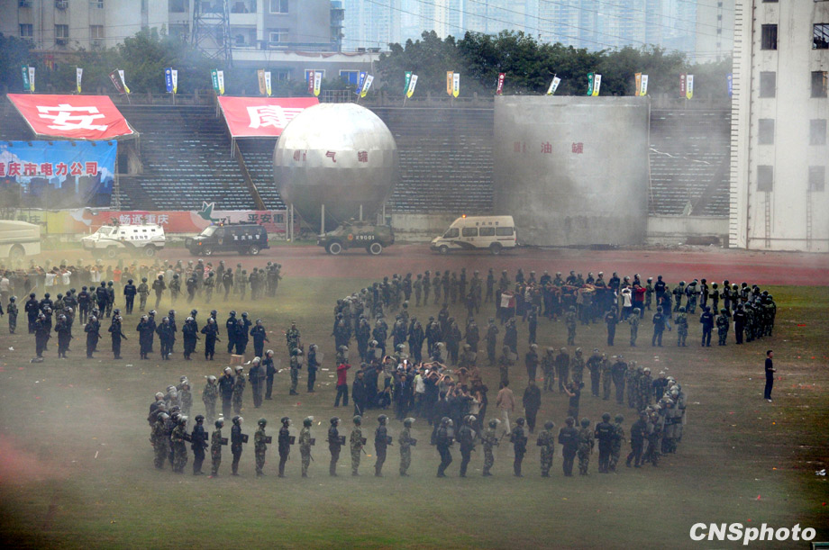 23日,推進(jìn)“平安重慶”建設(shè)突發(fā)事件應(yīng)急演練在該市渝中區(qū)大田灣體育場(chǎng)舉行,重慶各警種突精銳力量重裝登場(chǎng),將各類事件一一化解。
