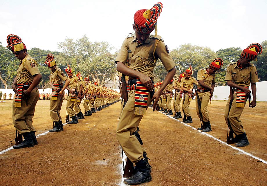 周三(21日),印度孟買,警方在一個紀念日上準備拔槍開火,向去年執(zhí)行任務中喪生的同僚表示敬意。 來源:中國新聞網(wǎng)