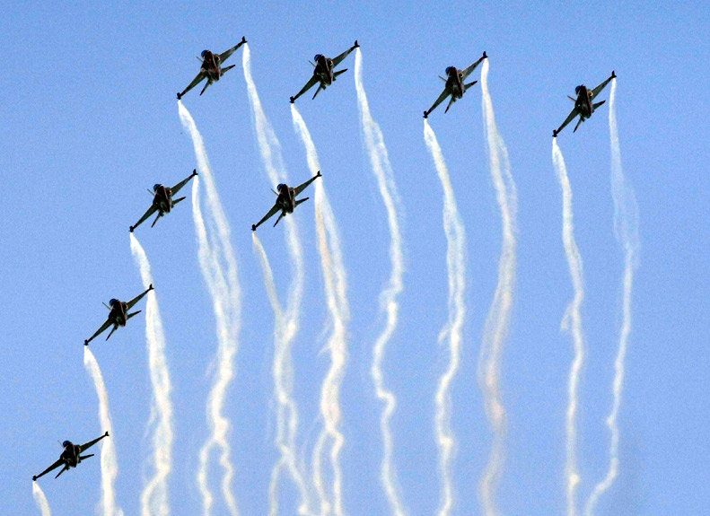 周二(20日),韓國黑鷹特技飛行表演隊在2009首爾國際航空航天與國防展上進(jìn)行精彩的特技飛行表演。 來源:中國新聞網(wǎng)