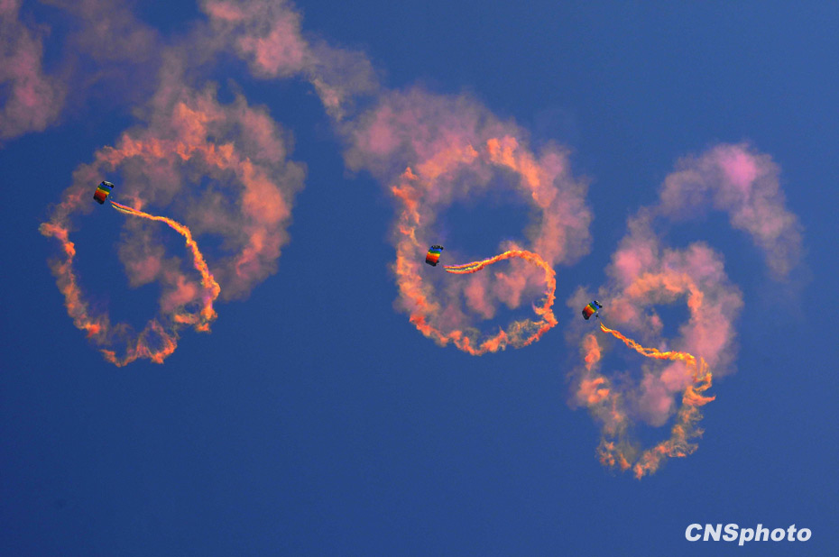 十一月三日,空軍八一飛行表演隊和空軍八一跳傘隊在北京沙河機場舉行預(yù)演,迎接十一月十一日中國人民解放軍空軍建軍六十周年。圖為空軍八一跳傘隊表演。中新社發(fā) 潘旭臨 攝