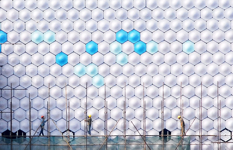圖為外形呈“會發(fā)光的墻”造型的中國信息通訊館。鈕一新/CFP