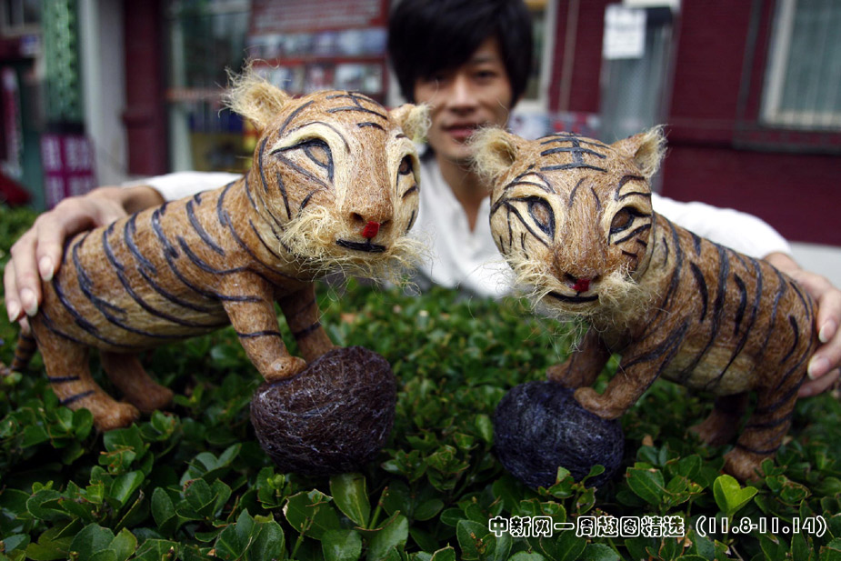 11月9日,北京一位時(shí)尚發(fā)型設(shè)計(jì)師正在展示頭發(fā)絲作品“;⑸裢辟R歲虎年。這是祖國(guó)60華誕之后的又一新作,四川青年理發(fā)師黃鑫用2.6公斤碎頭發(fā)制作了一對(duì)可愛(ài)逼真的“福虎”,歷時(shí)兩個(gè)多月的時(shí)間才完工。>>點(diǎn)擊觀看詳細(xì)內(nèi)容