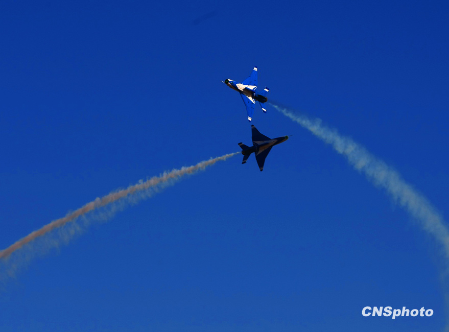 慶祝中國(guó)人民解放軍空軍成立60周年飛行表演,11月15日上午在北京沙河機(jī)場(chǎng)舉行。表演按八一飛行表演隊(duì)4架殲-10飛機(jī)表演12個(gè)動(dòng)作和6架殲-7GB飛機(jī)表演15個(gè)動(dòng)作,分四機(jī)對(duì)頭交叉、四機(jī)菱形隊(duì)大坡度盤旋、單機(jī)小速度平飛等27個(gè)動(dòng)作,其中四機(jī)對(duì)頭交叉動(dòng)作是這次表演中技術(shù)難度較大的動(dòng)作之一,這是國(guó)產(chǎn)三代飛機(jī)和國(guó)產(chǎn)二代飛機(jī)首次同場(chǎng)競(jìng)技表演。圖為殲-7GB進(jìn)行表演。中新社發(fā) 宋吉河 攝