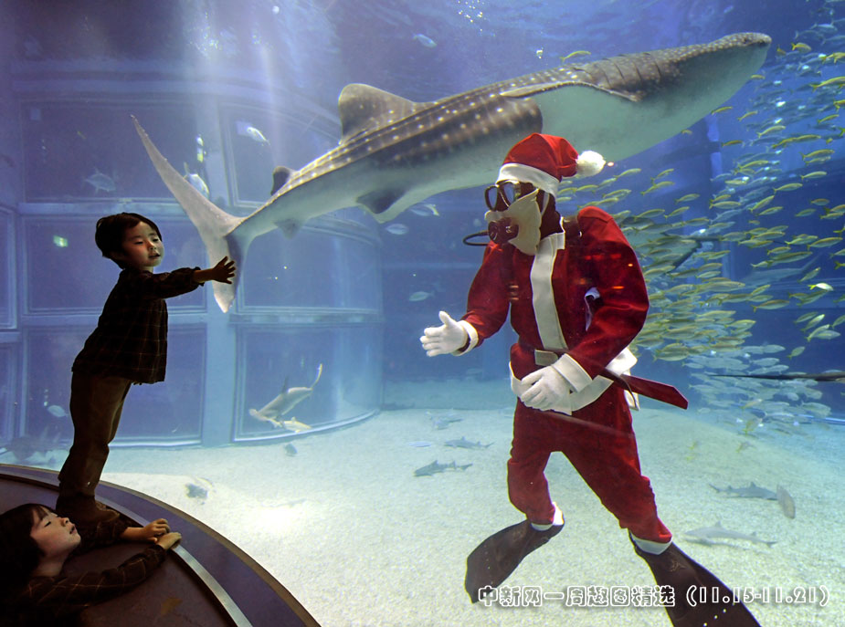 11月19日,一名裝扮成圣誕老人的潛水員在日本大阪水旅館的水族箱內(nèi)歡迎游客光臨。這是該水族館為了迎接每年一度的圣誕節(jié)而搞的活動(dòng)。圖片來源:中國新聞網(wǎng)>>點(diǎn)擊觀看詳細(xì)內(nèi)容