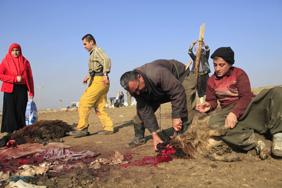 11月28日,世界各國(guó)的穆斯林迎來(lái)傳統(tǒng)節(jié)日“宰牲節(jié)”。圖為伊拉克的穆斯林在宰牲節(jié)上宰殺牲畜。