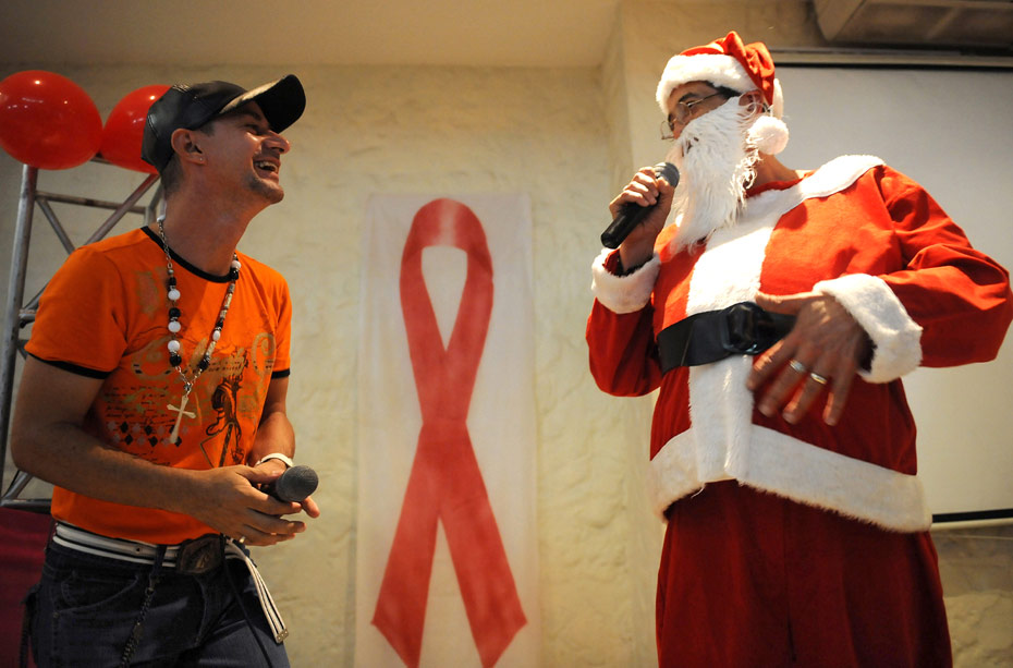 圖為哥倫比亞一位“圣誕老人”在為艾滋病日做宣傳。12月1日是世界艾滋病日,2009年世界艾滋病日的主題是“普遍可及和人權(quán)”。世界各地民眾組織各種活動(dòng)呼吁人們關(guān)注艾滋病。圖片來源:中國(guó)新聞網(wǎng)