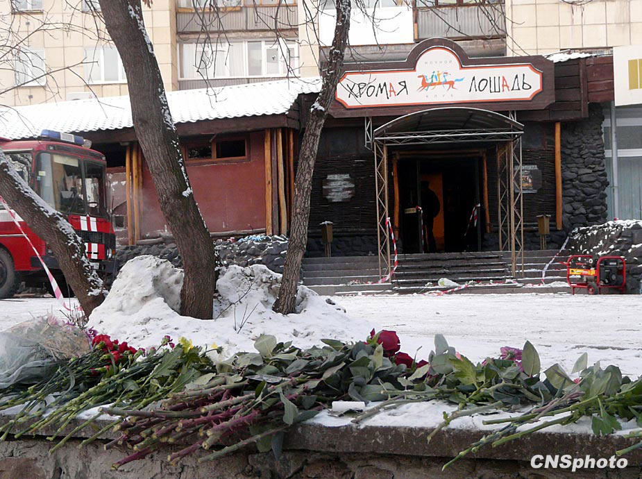 十二月六日,俄羅斯彼爾姆市民眾自發(fā)來到夜總會(huì)火災(zāi)事故現(xiàn)場(chǎng),悼念遇難者。圖中紅色建筑即為失火夜總會(huì)。中新社發(fā) 田冰 攝